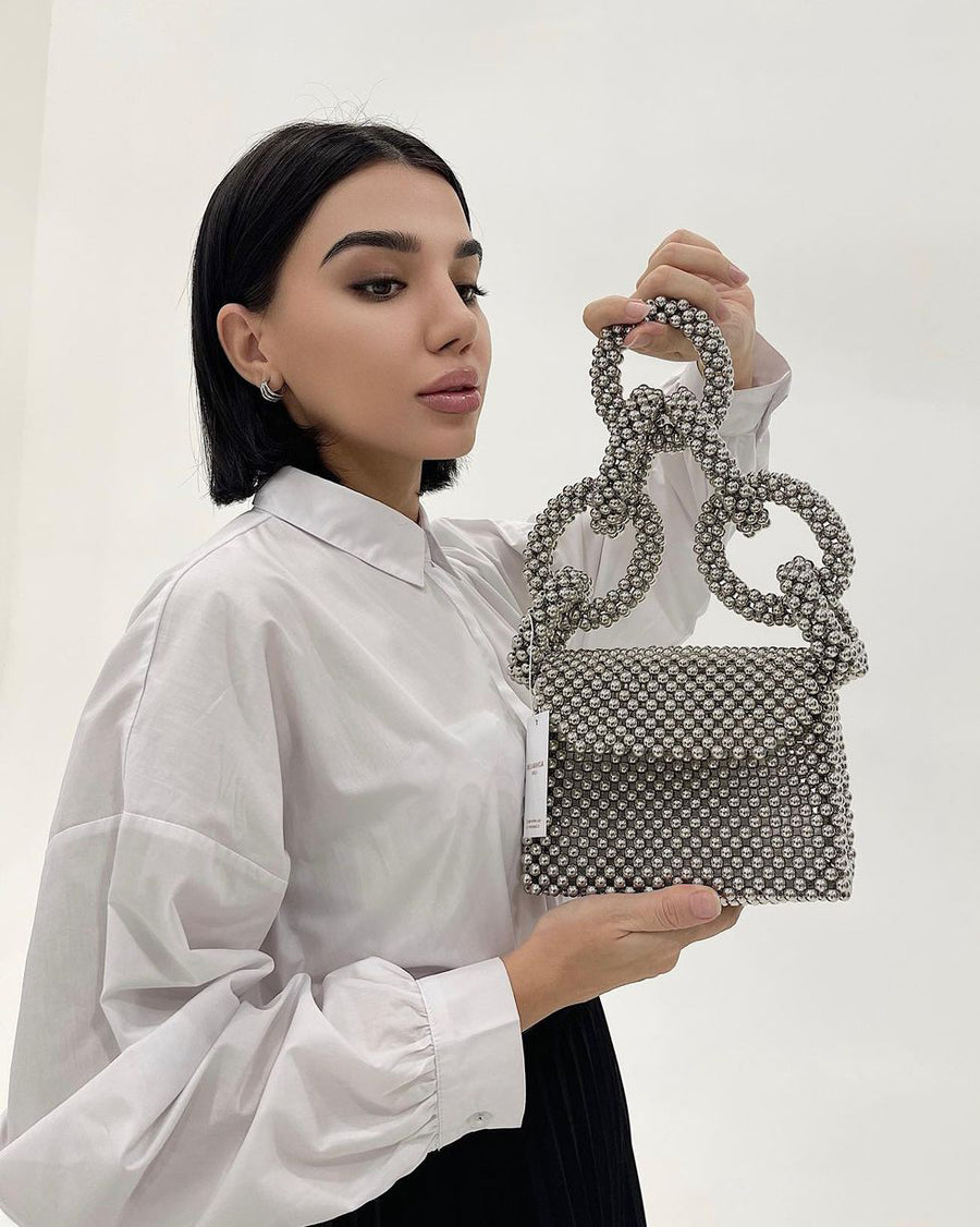 Style Note: Elevate your look with the Grey Signature Crystal Bag – where luxury meets elegance